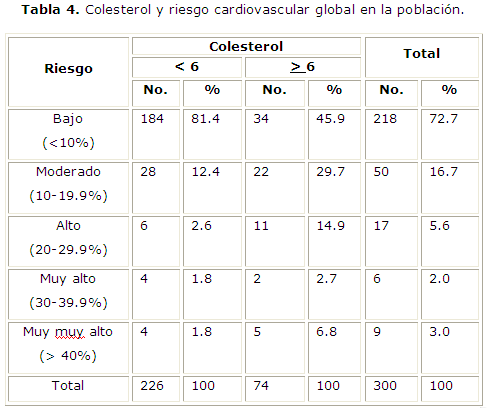 Casi el 30% de la población con colesterol por encima de 6,0 mmol/l, presentó un RCG moderado y cerca del 15% de la misma fue alto riesgo. Tabla 4.