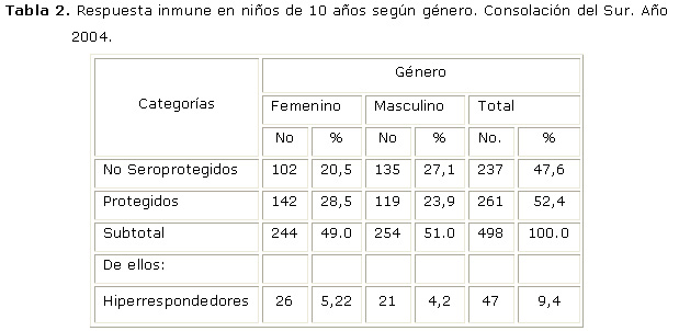 En la tabla 2 observamos la respuesta inmune según el género de los 498 escolares. De ellos 47,6 % fueron no seroprotegidos con un incremento en el género masculino de 6,6 % con relación al femenino, en la categoría de seroprotegidos se aprecia un 52,4 % en los dos géneros con ligera diferencia a favor de las féminas. En el caso de los hiperrespondedores (9,4%) la diferencia fue mínima. Sí bien había un ligero incremento de varones no seroprotegidos, las cifras se invertían en cuanto a los protegidos; lo que resultó en diferencias entre géneros, (X2 = 6.42; gdl = 1; p = 0.01).
