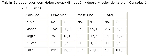 En cuanto a las características socio - demográficas se estudiaron los factores de riesgos que pudieron influenciar en la respuesta inmune para la vacuna cubana Heberbiovac-HB, resultando que el género y el color de la piel no presentaron diferencias significativas, la distribución para ambas variables fue uniforme y similar a los caracteres en la población de Consolación del Sur para este grupo poblacional.