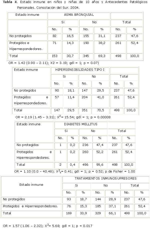 Se encontró asociación significativa entre las hipersensibilidades Tipo I y el estado de protección vacunal por HBsAg, y aquellos niños que habían recibido tratamientos inmunosupresores. Había incremento de niños protegidos o hiperrespondendores en aquellos escolares que eran asmáticos y se encontraban de igual forma más niños protegidos o hiperrespondendores en aquellos escolares que no habían recibido tratamientos inmunosupresores. (Ver tabla 4).