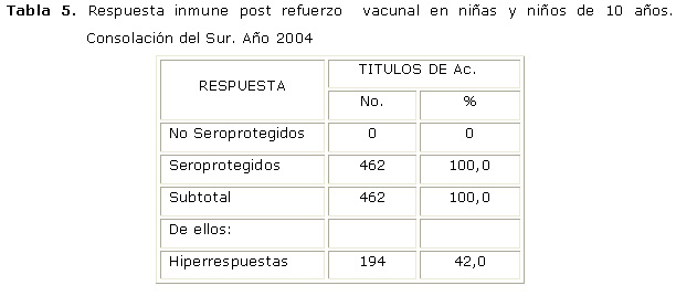 La (tabla 5) nos muestra que no habían niños y niñas no seroprotegidos, todos eran protegidos (100.0 %) y de ellos hiperrespondendores (42.0 %). Después del refuerzo vacunal. La comparación de frecuencias según el estadígrafo de McNemar dio resultados altamente significativos (X2A/D = 71.78; gdl = 1; p = 2.4 x 10-17; X2 B/C = 259.00; gdl = 1; p = 2.8 x 10-58).