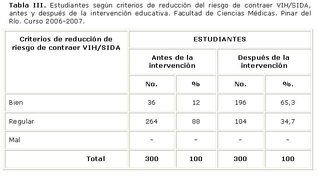 Impresiona que el criterio de cómo reducir el riesgo de contraer el VIH/SIDA, solo es señalado bien por un 12 % de los encuestados, 88 % regular y ninguno mal, lo que demuestra desconocimiento en este sentido; sin embargo, gratifica la evolución positiva que se evidencia en la Tabla III, donde las respuestas de bien ascienden a un 65,3% y disminuye a un 34,7%, las que continúan con dificultades. (X2M-N=32,01; gdl=1; p=5.9 x 10-9).