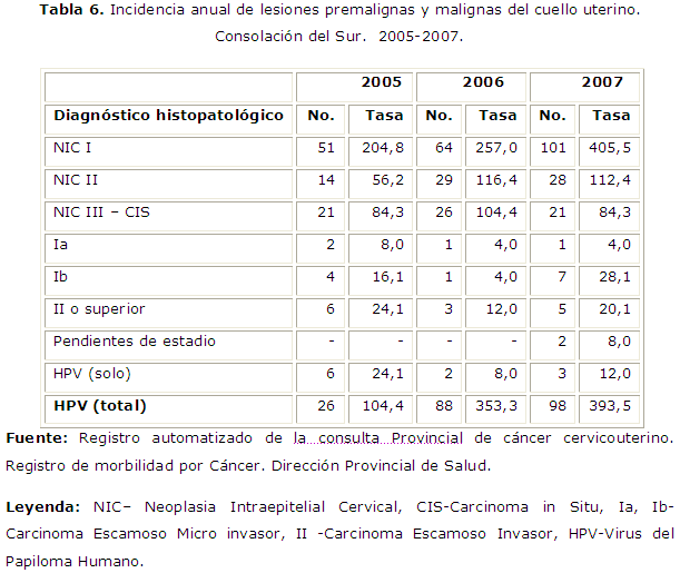 La incidencia anual de lesiones premalignas y malignas mostró un incremento de las NIC I (204.8 x 100 000 mujeres en el 2005, a 405.5 x 100 000 mujeres en el 2007) (tabla 6). Las NIC II mostraron variaciones y las NIC III- CIS se mostraron estables en el período. Los carcinoma micro invasores disminuyen y los invasores aumentaron. A pesar de ello, los invasores en estadio II o superior representaron solo la cuarta o quinta parte del total de CIS detectados.