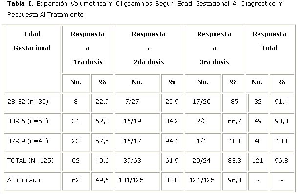 La primera dosis de tratamiento (tabla I) solamente permitió la recuperación del ILA en el 49,6 % de las mujeres tratadas; una 2da dosis lo incrementó hasta el 80.8% y al terminar las 3 dosis el 96.8%. Esto logró alargar el tiempo de gestación y permitir la inducción de la maduración pulmonar fetal.