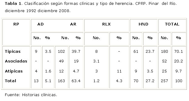 En cuanto a las formas de transmisión de la enfermedad, estudios cubanos realizados en las familias de la Habana y en Las Tunas,2,10 así como otros realizados en EEUU, Francia, Japón y Dinamarca8 reflejan que la herencia autosómica recesiva es la forma más frecuente de transmisión en pacientes que padecen de RP.
