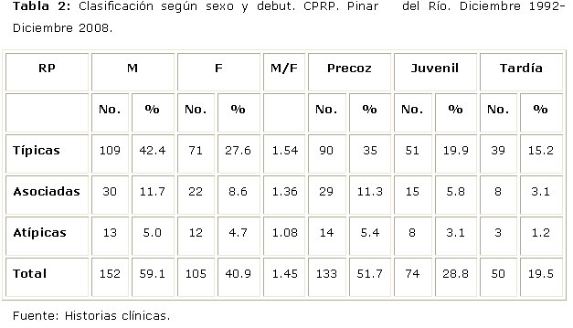 Diversos autores señalan que el debut de la enfermedad ha sido siempre antes de los 20 años, agregan además que el comienzo por encima de los 50 años es excepcional.1 El debut precoz y el sexo masculino son resultados también expresados en los estudios de otros autores cubanos.5, 9-10, 13-14
