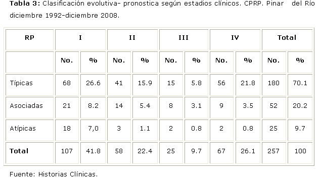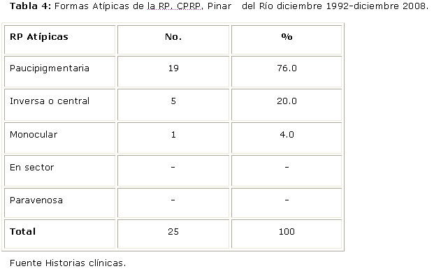 Entre las RP Atípicas, la forma paucipigmentaria representó el 76% (Tabla 4).