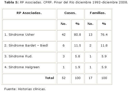 En ocasiones la RP forma parte de un síndrome (RP Asociada) y no aparece el cortejo sintomático que hace pensar en esta enfermedad inicialmente (1). El Síndrome Usher es la forma más frecuente de RP Asociada, constituye la primera causa de sordo ceguera hereditaria y su prevalencia es variable. Oscila entre 3,0 / 100 000 en Escandinavia y 4,4 / 100 000 en Estados Unidos y en Cuba es la forma sindrómica de RP más frecuente.14