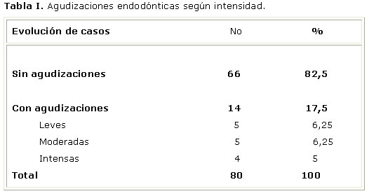 Pudiese parecer alta la frecuencia de aparición de agudizaciones encontrada, ya que Eleazer y Eleazer las refieren entre 1.5 y 5.5%, considerando todos los diagnósticos pre-tratamiento de manera conjunta.2 Por su parte, Imura obtiene cifras casi idénticas a la presente investigación, y las diagnostica entre el 1.4 y 16 % de los casos.4 Walton y Torabinejad, al revisar lo publicado de la temática, encuentran reportes tan variables y extremos como 1.5 y 45 % de los casos tratados.5