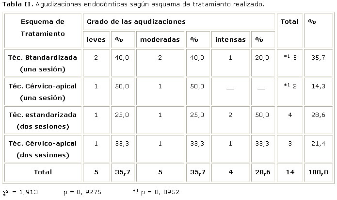 Al observar la tabla II, y analizar los resultados obtenidos con diferentes esquemas de tratamiento del conducto radicular se puede constatar que el mayor número de agudizaciones aparecieron con el empleo de la técnica estandarizada en una sesión (5) para 37,5% del total, mientras que el menor número (2) para un 14,3%, se encontró con la técnica cérvico apical en una sola sesión.