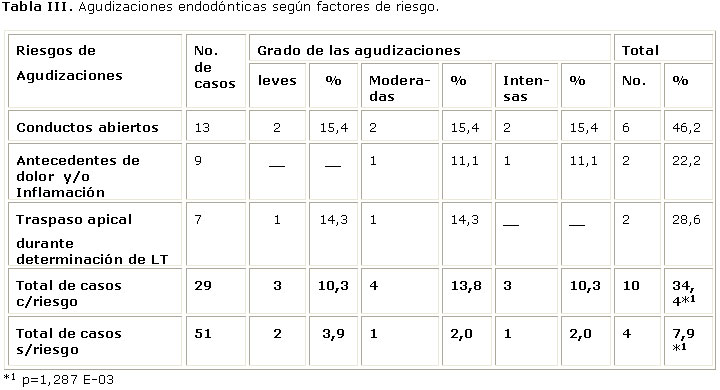En la tabla III, al observar los factores de riesgo estudiados, se puede apreciar que de los conductos abiertos al medio bucal, bien fuese por caries u otras causas, el 46,2 presentaron agudizaciones endodónticas. Resulta oportuno resaltar que del total de casos en que se produjo traspaso del ápice radiográfico durante la determinación de la longitud de trabajo, el 28,6% presentaron exacerbaciones.