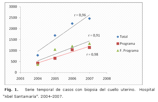 En dos de las series hay un incremento significativo (p < 0,05) en el total de biopsias y en los casos de Programa (r = 0.96; p = 0.035) y (r = 0.98, p = 0.021) respectivamente; mientras que en los fuera de programa el coeficiente de correlación era menor r = 0.91; p = 0.088)