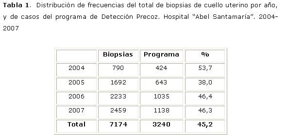 Como se observa en la Tabla 1, el total de casos con biopsias aumentaba progresivamente en el período. Todo ello hace que el total sea de 7174 biopsias que interesaron el cuello del útero, de las cuales 3240 (45.2 %) eran de Programa de Detección Precoz.