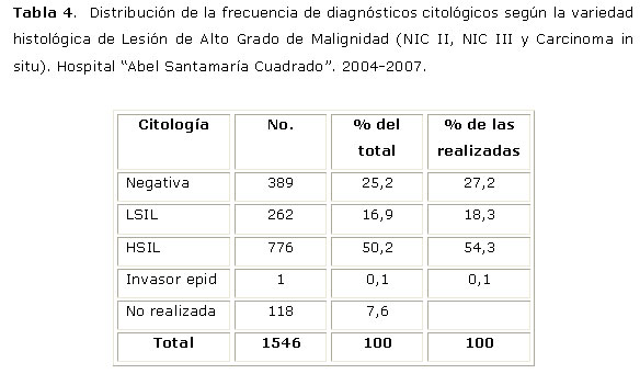 En la tabla 4 se observa la correlación cito-histológica en las lesiones de alto grado (NIC II, NIC III y CIS).