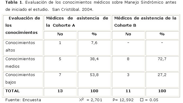 Se concluye que la mayoría de los médicos presentaron antes de realizado el estudio desconocimientos acerca de los pilares establecidos para el manejo sindrómico de casos. Las complicaciones de las ITS más frecuentemente reportadas antes de implementado el estudio fueron la enfermedad inflamatoria pélvica aguda, la salpingitis y los abscesos tubo-ováricos. Después de realizado continuaron siendo estas complicaciones las que con más frecuencia aparecieron, pero la reducción experimentada en la cohorte A fue muy significativa. El mayor número de pacientes a los que se les aplicó tratamiento según el manejo sindrómico de casos resolvió su patología antes de los 7 días posteriores al tratamiento, mientras que los pacientes tratados aplicando el diagnóstico etiológico (cohorte B), curaron su afección entre 8-15 días después de la terapéutica. Se evidenció la superioridad del manejo sindrómico de casos para la reducción de las ITS y sus complicaciones.