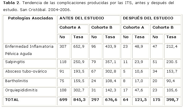 Se informa en la tabla 2 sobre la tendencia de las complicaciones producidas por las ITS antes y después de efectuado el estudio. Los resultados encontrados fueron estadísticamente significativos.