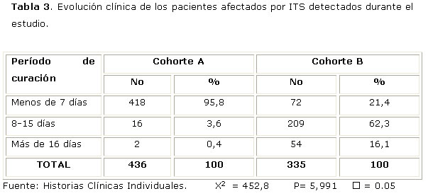 Se informa en la tabla 3 la evolución clínica de los pacientes afectados por las infecciones de transmisión sexual. En la cohorte A se cuantificaron el mayor número de pacientes curados antes de los 7 días con 95,8% de resolutividad. Sin embargo, en la cohorte B predominaron los pacientes curados entre los 8-15 días posteriores al tratamiento (209 pacientes; 62,3% de curación). Predominó la curación de los casos a partir de los 16 días en la cohorte B con 54 pacientes (16,1%). Los resultados estadísticos fueron significativos.
