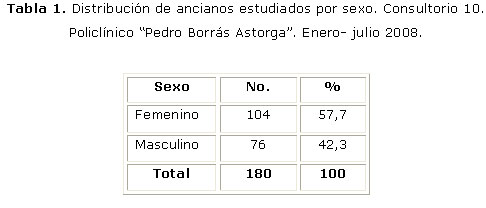 En los 180 ancianos convivientes en el Consultorio 10 del Policlínico "Pedro Borrás Astorga", existió un predominio de gerontes del sexo femenino, como lo muestra la tabla 1.