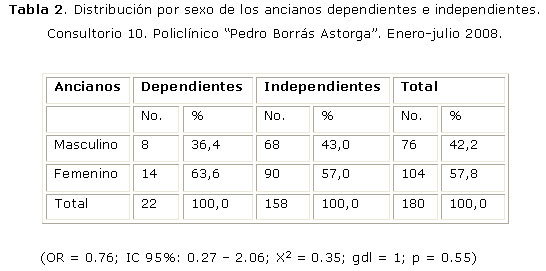 En cuanto al sexo, resultaron con discapacidad física 14 mujeres (13,5%) y 8 hombres (10,5%), según la tabla 2, esto es, 22 ancianos de ambos sexos discapacitados. Es importante destacar que no hay asociación entre el sexo y la clasificación de dependencia e independencia, según los resultados del OR y del Ji cuadrado.
