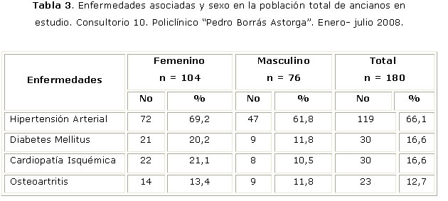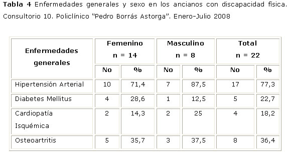 Como se observa, la hipertensión arterial y la osteoartritis constituyeron problemas de salud en la población geriátrica estudiada, con una elevada prevalencia en la primera y siendo la segunda casi cuatro veces más frecuente en la población discapacitada. Se recomienda incrementar las acciones preventivas, educativas y de control en busca de cambios favorables en hábitos y estilos de vida en los ancianos estudiados, dada la alta frecuencia de lahipertensión arterial en los mismos.
