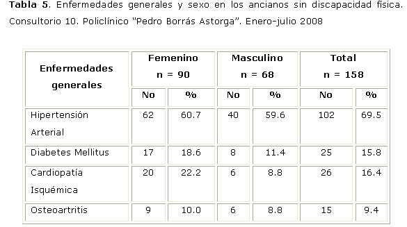 Estas enfermedades estudiadas, tanto en los ancianos con discapacidad física (tabla 4), como en los no discapacitados (tabla 5), muestran una elevada prevalencia de la hipertensión arterial, sobre todo en los discapacitados, que alcanza el 77,5%, llegando al 87,5 en el sexo masculino. La osteoartritis se eleva en ancianos dependientes a 36,2% y sólo al 9,4% en ancianos no dependientes.