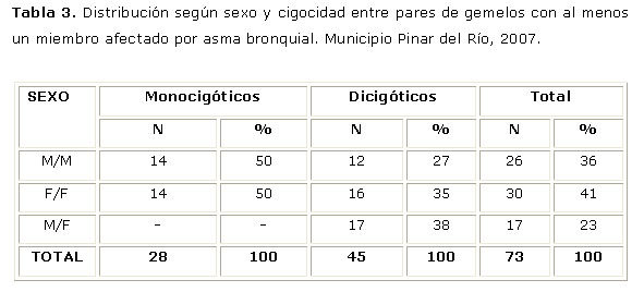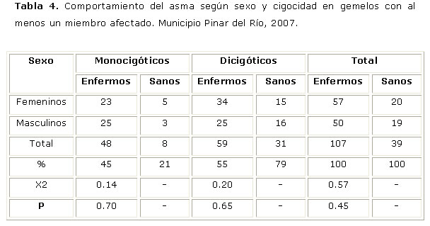En la tabla 4 muestra la distribución de gemelos afectados por asma bronquial, sexo, y cigocidad. En general no se encontró asociación entre la variable sexo y la presencia de enfermedad, por lo que en esta muestra no hubo asociación del sexo con la presencia de AB.