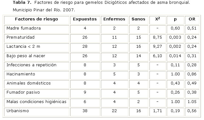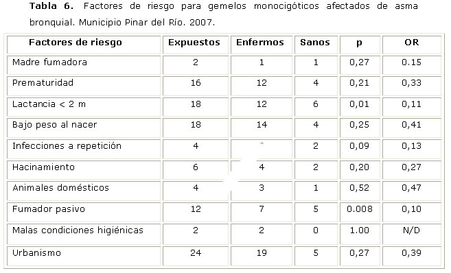 En cuanto a los factores de riesgo para el asma bronquial en gemelos afectados fueron separados según cigocidad. (tabla 6 y 7). En gemelos monocigóticos ninguno de los factores de riesgo estudiados tuvo significación estadística, con excepción de la exposición al humo del tabaco (fumadores pasivos). En los gemelos dicigóticos los factores de riesgo relacionados con el periparto como: prematuridad, bajo peso al nacer y la lactancia materna menos de 2 meses resultaron estadísticamente significativos. Los factores ambientales tales como ser fumador pasivo, las malas condiciones higiénico sanitarias de las viviendas, la presencia de animales domésticos, hacinamiento y urbanidad, tuvieron una alta incidencia en nuestro trabajo.