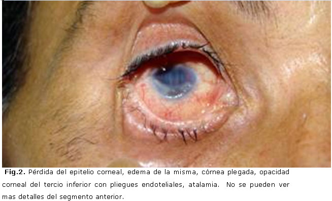 Segmento Anterior: Pérdida del epitelio corneal con edema de la misma. Córnea plegada, opacidad corneal del tercio inferior con pliegues endoteliales, atalamia. No se pueden ver más detalles del segmento anterior. (Fig. 2, 3 y 4)