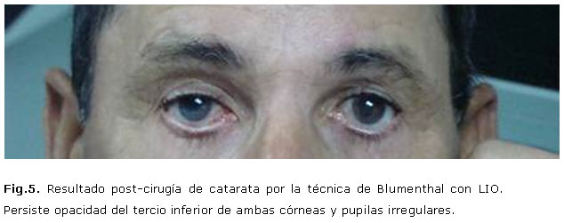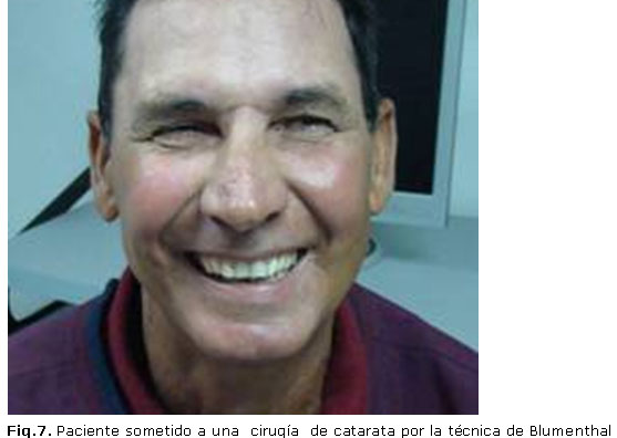Al trascurrir tres meses de su mejoría clínica y oftalmológica el paciente que había quedado con secuelas oculares tales como cataratas, sinequias posteriores y opacidades corneales del tercio inferior de la córnea fue sometido a cirugía de catarata por la técnica de Blumenthal con lente intraocular (LIO) post-sinequiotomía, (Fig. 5) y alcanzó una visión actual de 0.5 y 0,6 en ambos ojos. (Fig. 6 y 7).