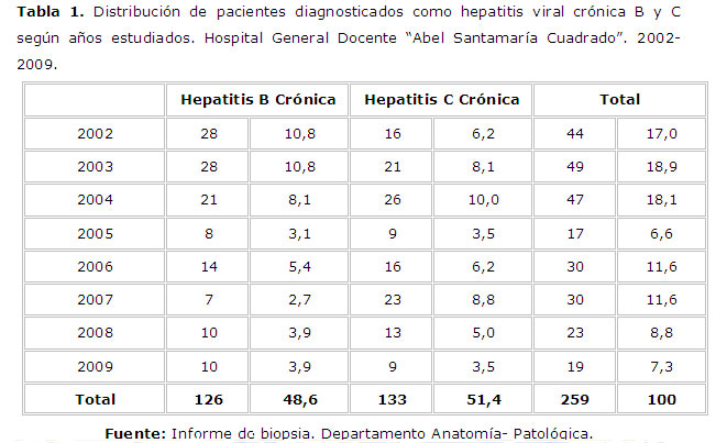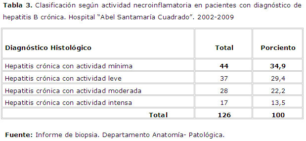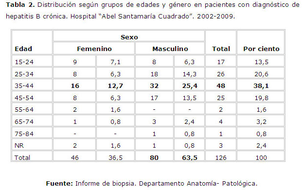 Se realizó una investigación retrospectiva y transversal durante el período de enero de 2002 a diciembre de 2009 en pacientes con el diagnóstico histológico de hepatitis viral crónica. El universo estuvo constituido por los 259 pacientes con este diagnóstico en el departamento de Anatomía Patológica del Hospital General Docente "Abel Santamaría Cuadrado" y la muestra por los 126 pacientes con el diagnóstico de hepatitis B crónica. Del informe de biopsias se extrajeron los datos de edad, sexo y diagnóstico histológico.