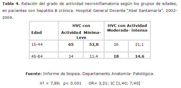 Al relacionar el grado de actividad necroinflamatoria y la edad en los 123 pacientes con el dato (tabla 4), se observó que en edades inferiores a 45 años predominó la actividad necroinflamatoria mínima y leve, y por encima de esta edad la moderada e intensa, resultando altamente significativo (X² = 7,89; p<0.001). La edad incrementa el riesgo en la intensidad de la actividad necroinflamatoria. OR= 3,21; C [1,40; 7,40].