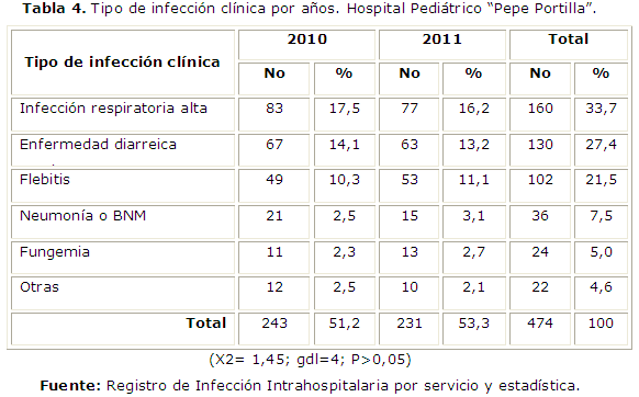 En la tabla 4 se presenta el tipo de infección clínica por años, donde predominaron las infecciones respiratorias agudas en 160 (33, 7 %) niños, seguida de las enfermedades diarreicas agudas y las flebitis con 130 (27,4 %) y 102 (21, 5 %) niños respectivamente, diferencias no significativas (X2= 1,45; gdl=4; P>0,05).