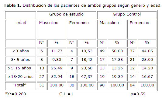 Puede observarse la distribución de los pacientes de ambos grupos según el género y edad. Existió una homogeneidad entre ambos grupos con relación al género, no así con la edad donde hubo mayor afectación por forunculosis en los niños con edades mayores, tabla 1.