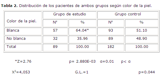 Se muestra la distribución de los pacientes de ambos grupos según el color de la piel. En el grupo de estudio existió predominio de los pacientes de color de la piel blanca sobre los no blanca; no así en el grupo control. Se muestra la asociación entre el color de la piel y la presencia de forunculosis (p<0,05), tabla 2.