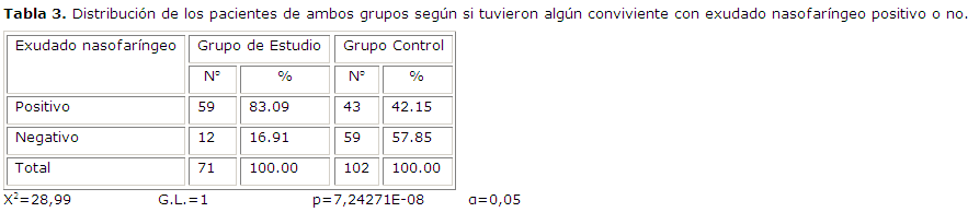 Se evidencia la asociación estadística muy significativa entre la presencia de al menos un conviviente con exudado positivo a estafilococo coagulasa positiva y la posibilidad de desarrollar la forunculosis recidivante. Ver tabla 3. No fue posible realizar exudado nasofaríngeo a todos los participantes.