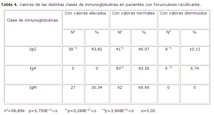 No se constató relación directamente proporcional entre la aparición de la forunculosis recidivante y la presencia de déficit de alguna de las clases de inmunoglobulinas.