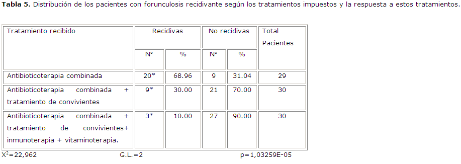 Se observa la distribución de los pacientes con forunculosis recidivante según los tratamientos impuestos y la respuesta a estos tratamientos. A todos los pacientes se les indicó un tratamiento específico según antibiograma, con antibióticos combinados. A 30 de ellos se les trató los convivientes con exudados positivos, con monoterapia, así como medidas profilácticas generales y el uso de crema de gentamicina a nivel del vestíbulo nasal, a todos fueran positivos o no. Otros 30 recibieron este tratamiento más vitaminoterapia, e inmunoterapia (factor de transferencia 1bb subcutáneo, semanal por 8- 10 semanas y en los casos que no hubo déficit de IgA, la inmunoglobulina humana IM a razón de 0,02 mlx kg/ cada 10 días por 2 meses), tabla 5.
