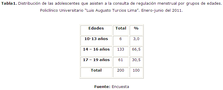 Se realizó un estudio descriptivo y transversal de todas las adolescentes pertenecientes al Policlínico Universitario "Luis Augusto Turcios Lima" del municipio de Pinar del Río, que asistieron a la consulta de regulación menstrual durante el período enero - junio del año 2011. El universo lo constituyeron 345 adolescentes, se tomó una muestra probabilística simple de 200 adolescentes pertenecientes al policlínico antes mencionado, que cumplieron los criterios de inclusión de desear participar en la investigación Se le aplicó una encuesta a estos con previo consentimiento de este y su padre y/o madre. Los datos fueron procesados y analizados con medidas de frecuencias (porcientos) y la prueba de hipótesis y los datos fueron llevados a tablas.