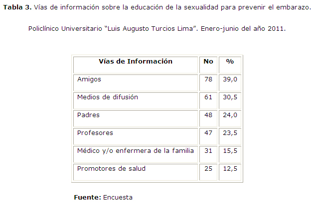 Se exponen las vías por las cuales recibieron la información sobre la educación de la sexualidad para prevenir el embarazo en la adolescencia. Los amigos y los medios de difusión son los más señalados por estos con un 39, 5% y un 30,5 % respectivamente, existiendo diferencia significativa, señalando el médico y la enfermera de la familia y los promotores de salud en quinto y sexto lugar con un 15,5% y un 12,5 % respectivamente, tabla 3.