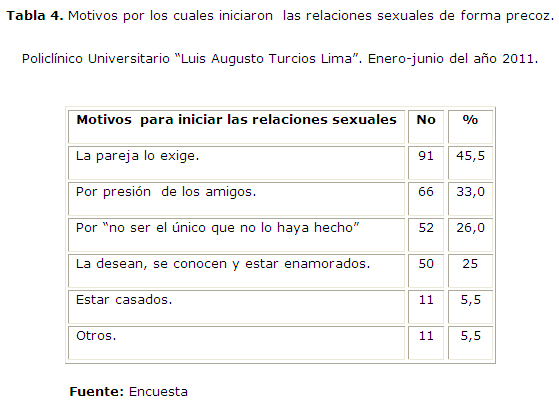Refleja los motivos por los cuales iniciaron las relaciones sexuales donde el 45,5% plantean que fueron por exigencias del otro miembro de la pareja seguido por la presión de los amigos del grupo con un 33 %, siendo significativos, tabla 4.