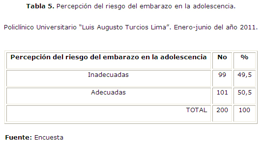 Se presenta que 50,5 % de las adolescentes encuestadas tienen una percepción adecuadas sobre el riesgo un embarazo en estas edades, tabla 5.