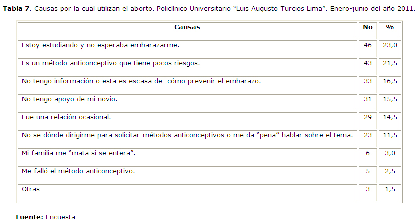 Muestra las causas por las cuales es utilizado el aborto por las adolescentes, considerando en los primeros lugares el estar estudiando y el "no esperaba embarazarme" (23 %) y ser un método anticonceptivo que tiene pocos riesgos (21,5 %), seguido por no tener información o esta ser escasa de cómo prevenir el embarazo y no tengo apoyo de mi novio con un 16,5 % y un 15,5 % respectivamente, tabla 7.