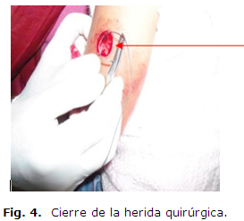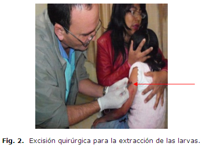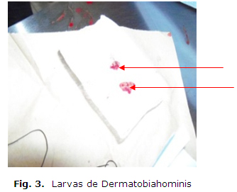 Acude a la consulta con las características antes señaladas, la encuesta epidemiológica, y por ser esa zona una de alta infestación de mosquitos, se piensa en una miasis cutánea. Se decide tratamiento quirúrgico, y se extraen dos larvas (fig. 2, 3, 4) de Dermatobiahominis, según sus características entomológicas. Se cerró la herida quirúrgica con puntos simples de seda. No se observaron complicaciones y la evolución fue favorable, curando la lesión en 7 días.