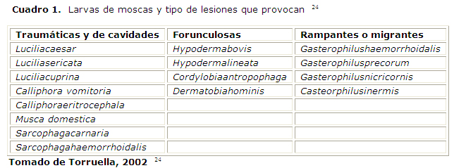 El término miasis fue propuesto por Hope (1840) para referirse a las enfermedades de los humanos que se originan específicamente de larvas de dípteros. Algunas de las larvas son de la mosca Cochliomyiahominivorax (Coquerel) 12y otras también frecuentes son la Dermatobiahominis, que existe en las áreas tropicales de América Latina desde Méjico hasta el Norte de Argentina. 13.