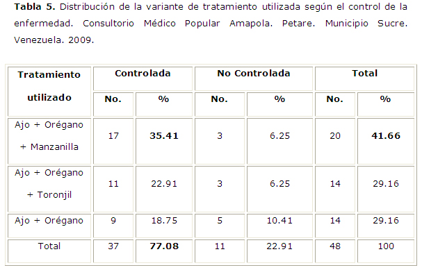 Se representan las variantes de fitoterapia realizadas y el control del asma bronquial, obteniéndose que el 77.08 % de los pacientes controlaron la enfermedad, utilizando el 35.41 % el tratamiento con ajo+ orégano+ manzanilla, tabla 5.