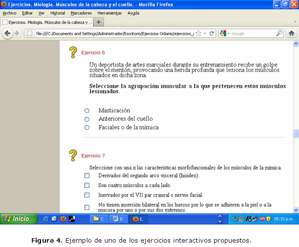 En la sección ejercicios los interactivos (figura 4) han sido elaborados con el programa exelearning, aquí cada subtema, tiene un grupo de ejercicios de este tipo, en los cuales se destacan los de test, falso y verdadero, relacionar los músculos con sus características observadas en las imágenes, identificar los músculos que se señalan, entre otros.